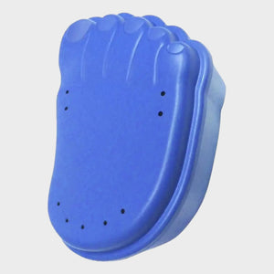 Caja de almacenamiento de plástico rígido con correa flexible para aparatos ortopédicos.