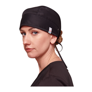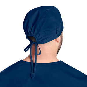 This adjustable cap that ties behind the head has snap tabs at the ears.
