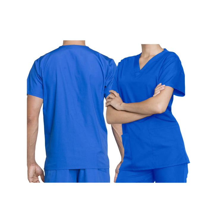 Este moderno conjunto unisex es un cómodo atuendo de trabajo médico, con un ajuste relajado tanto en la parte superior con cuello en V como en los pantalones con cordón, y múltiples bolsillos de parche para todas sus necesidades de almacenamiento.