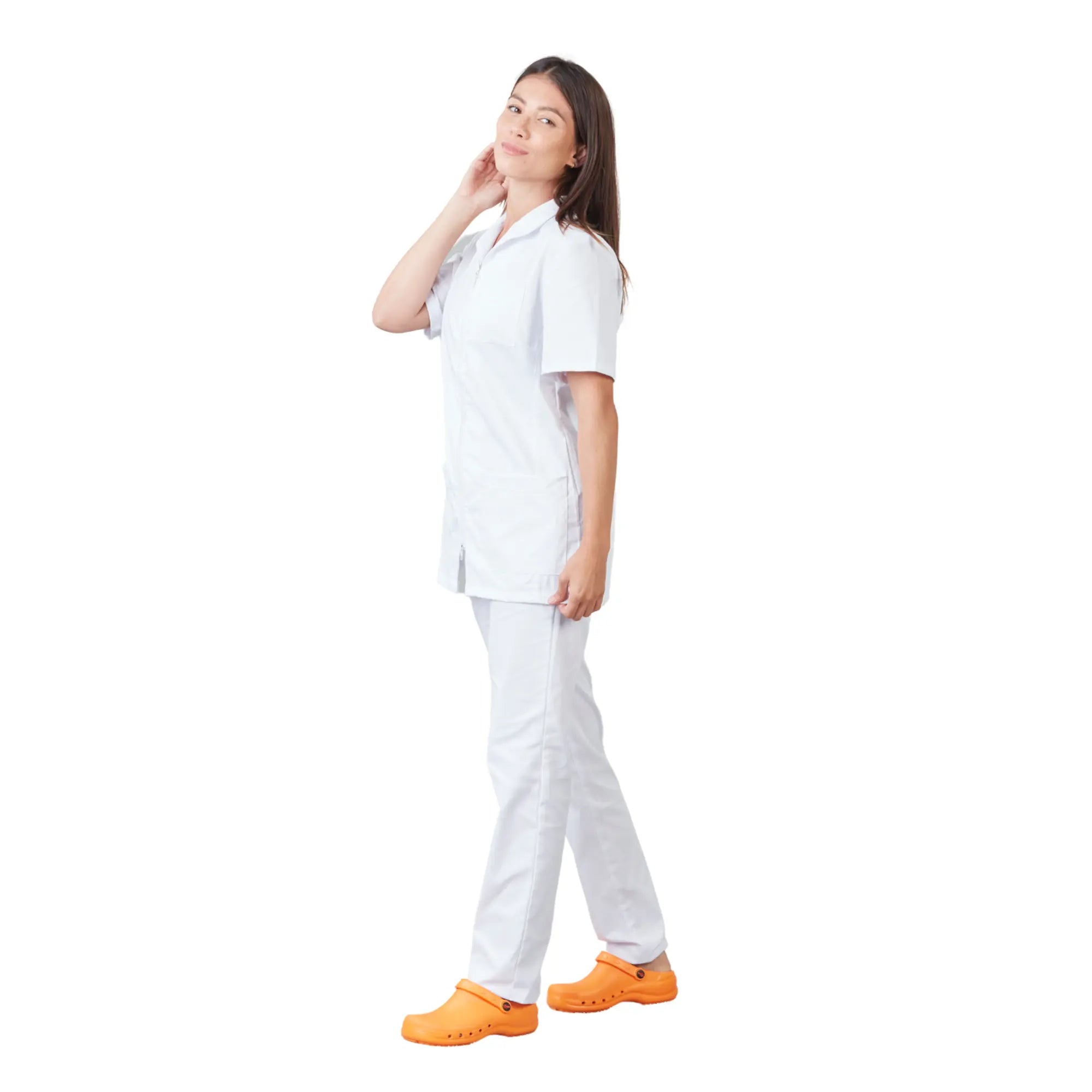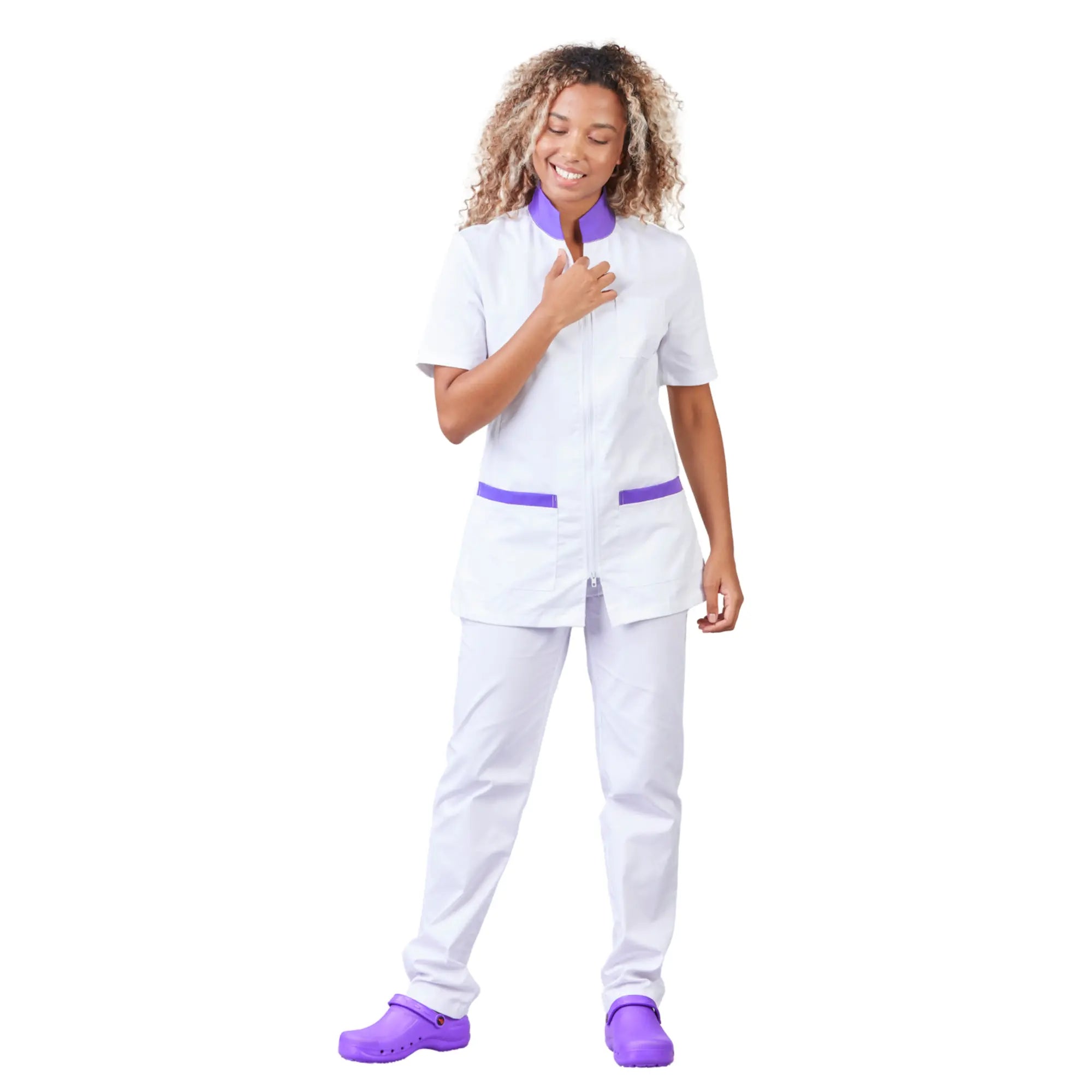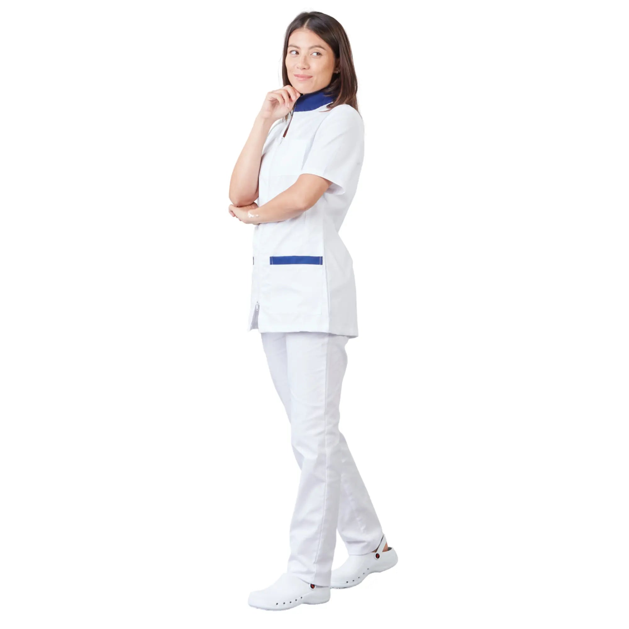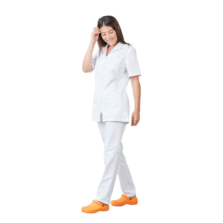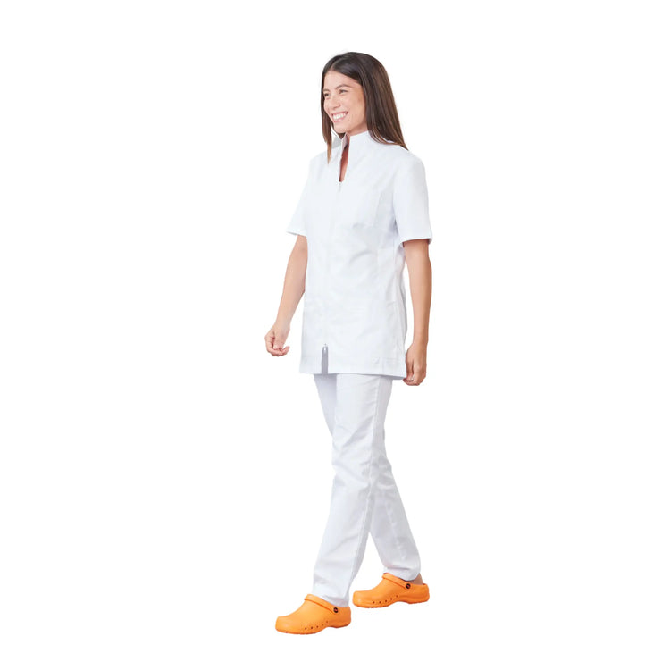 It's in the details that this medical tunic becomes irresistible, with a convertible collar, high version, or low version, tailored collar, hollow pleat at the back for greater ease, double slider zipper opening at the top and bottom.