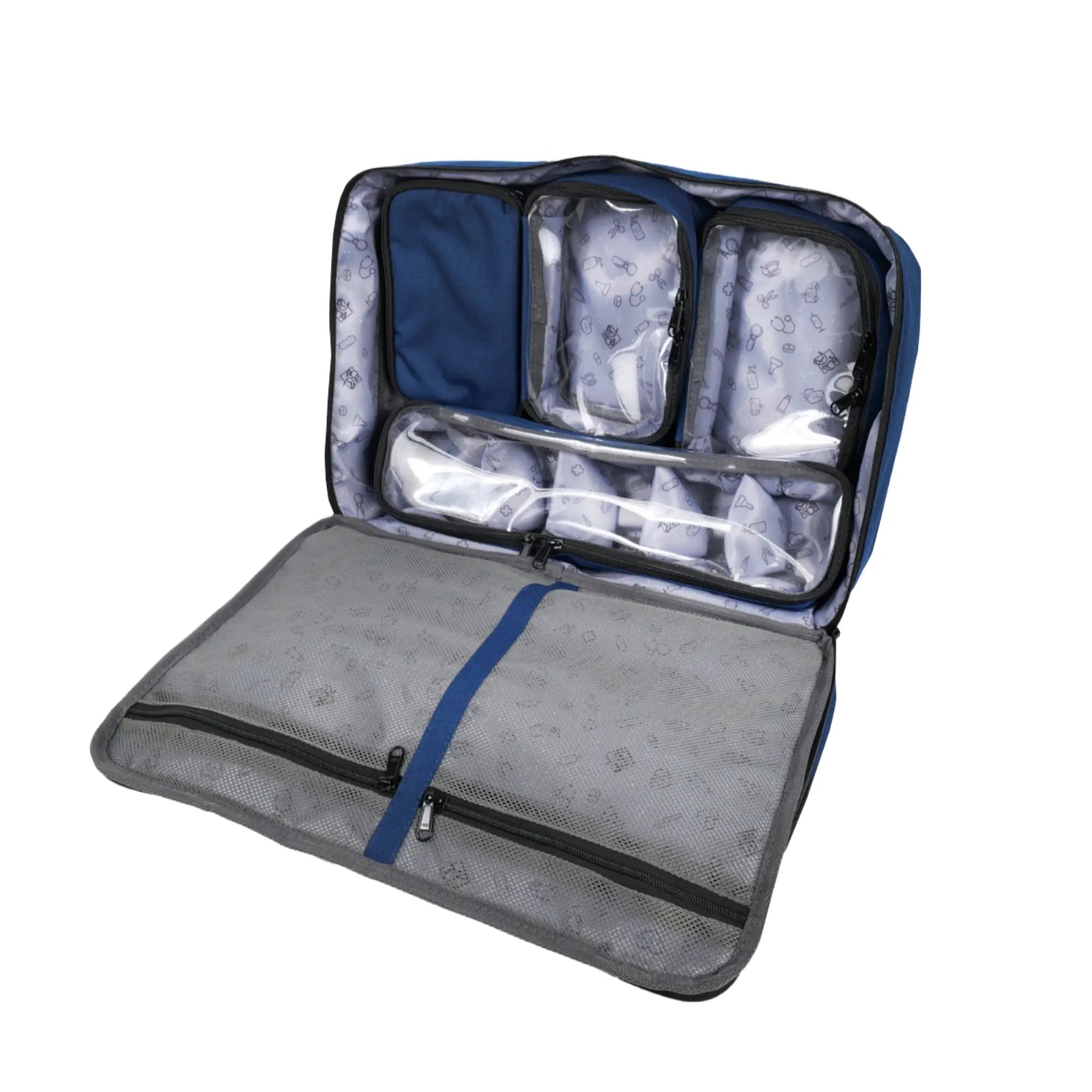 This model also has a large front pocket (45x21 cm) which opens completely with 2 zipped mesh storage compartments and 2 flat pockets on one side, and several elastic loops on the other side which allow you to store small care supplies: tweezers, scissors, penlight, thermometer, bandages, pens, etc.