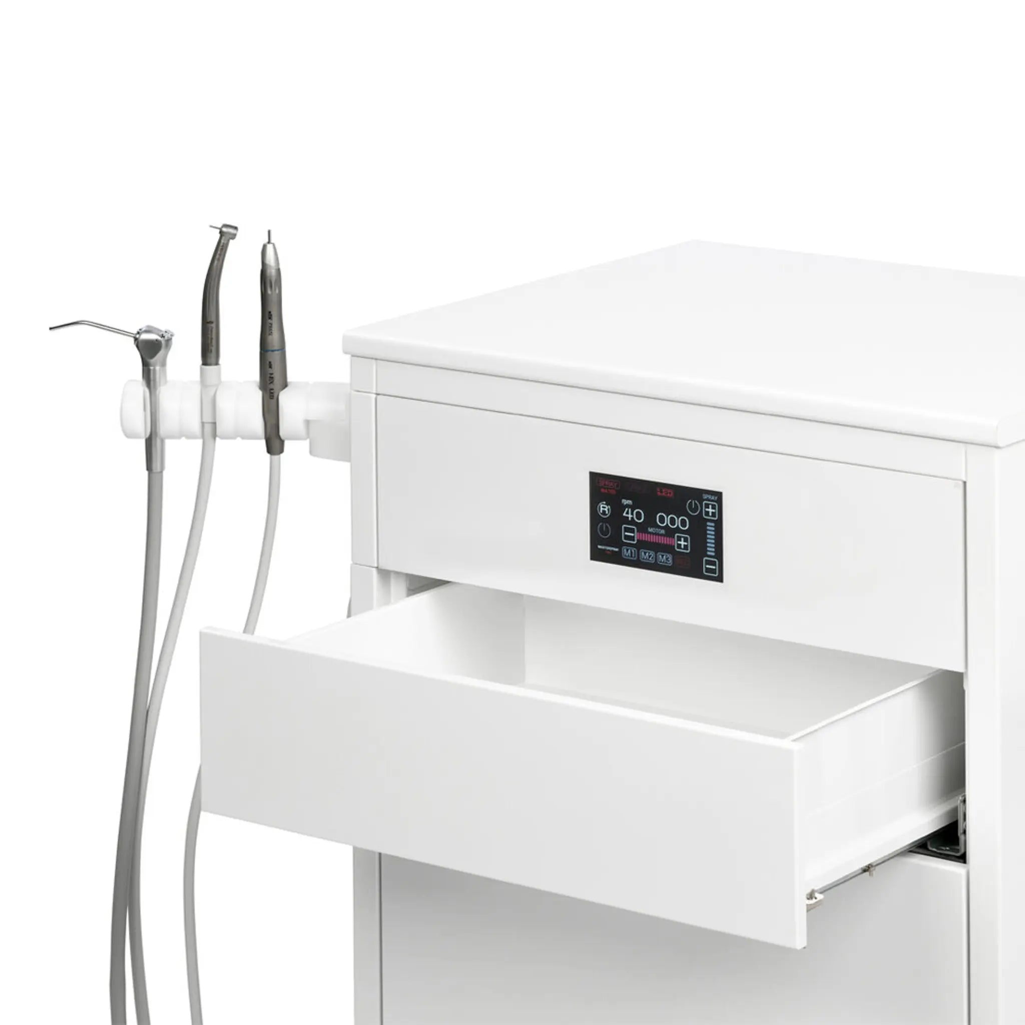 The MasterCab is equipped with a 3-function syringe (air, water, spray), an ultra-fast turbine (optional) and a micromotor with lightweight handpiece with 6 different handpieces to choose from.